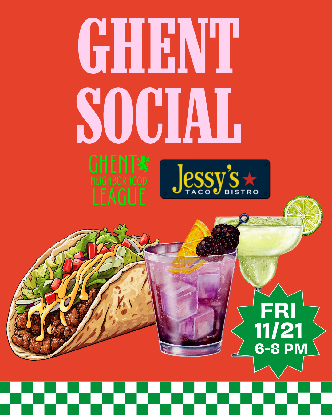 This is a relaxed, come-as-you-are gathering where neighbors can catch up, meet new friends, and enjoy food and conversation in a warm, convivial setting. Whether you’ve lived in Ghent for years or are new to the neighborhood, Ghent Social is a great way to connect, share what’s happening in the community, and support a beloved local spot. Join us at Jessy’s Taco Bistro and spend a couple of hours in good company with your neighbors.